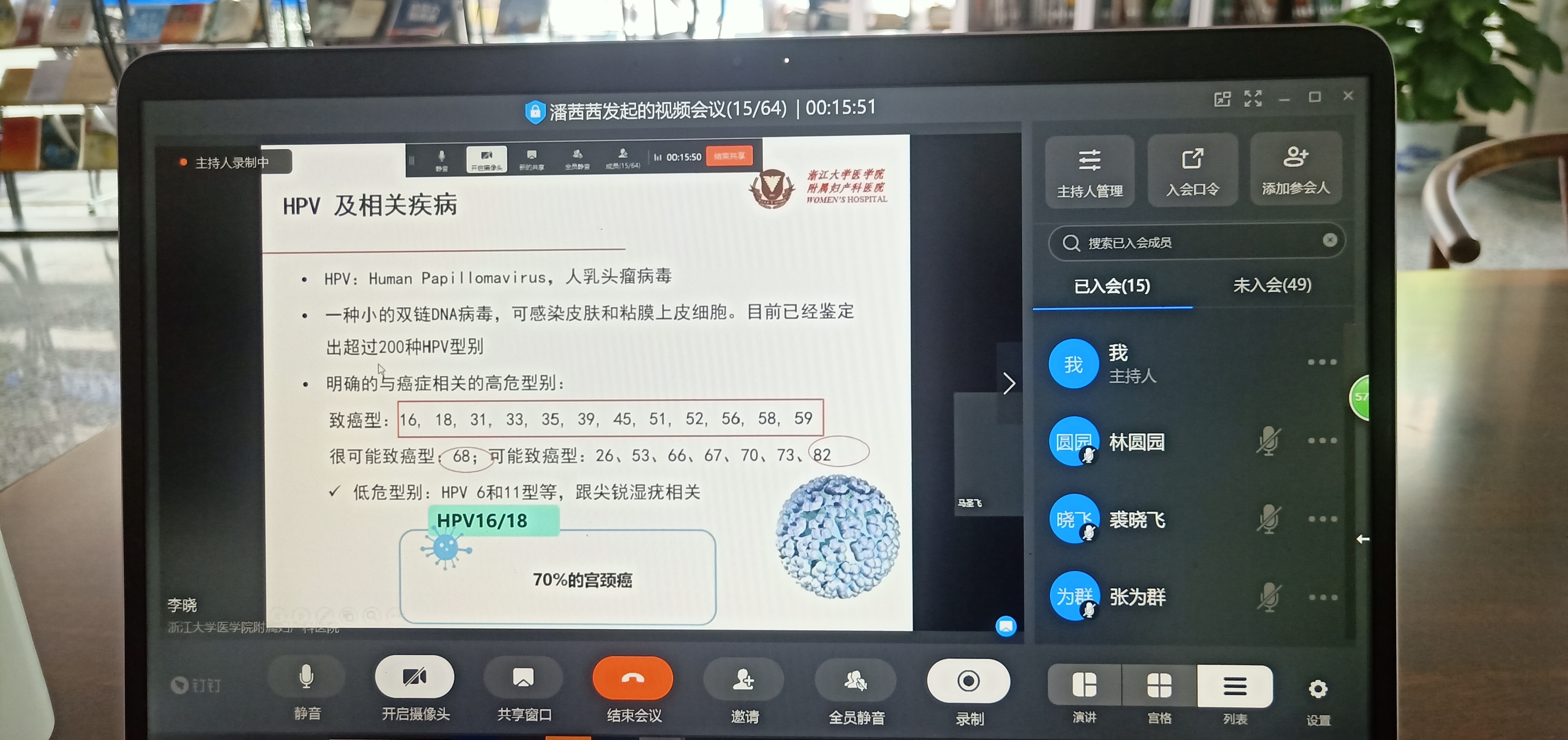 虽然是疫情期间,但是为了普及女教工保健知识,提高女教工自我防护、自我保养能力,促进女教工身心健康,浙江金融职业学院妇联、浙江金融职业学院工会女职工委员会和健康养生俱乐部于2020年6月13日(周六)上午10:00-12:00利用钉钉群联合组织开展了“关爱女性”线上课程第二课,课程主题为“宫颈癌防治和HPV疫苗”,主讲人为浙江大学医学院附属妇产科医院主任医师李晓。