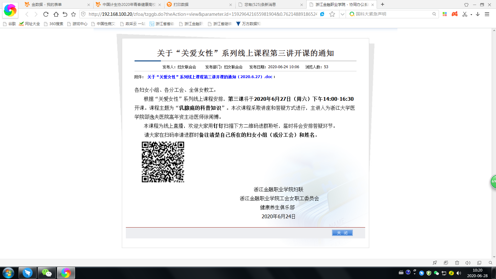 虽然是疫情期间,但是为了普及女教工保健知识,提高女教工自我防护、自我保养能力,促进女教工身心健康,浙江金融职业学院妇联、浙江金融职业学院工会女职工委员会和健康养生俱乐部于2020年6月27日(周六)下午14:00-16:30利用钉钉群联合组织开展了“关爱女性”线上课程第三课,课程主题为“乳腺癌的科普知识”,主讲人为浙江大学医学院邵逸夫医院高年资主治医师徐闻博。徐医师主要从解剖及生理、乳腺癌概况、乳腺癌危险因素、是否做基因检测、致病原因、良性生活方式、乳腺癌典型表现、乳腺的检查手段、乳腺病灶影像分级、乳腺癌筛查及防治等方面作了详细介绍,不少女教师女同学参加了本次活动,在最后的答疑环节中向徐医师进行了详细的咨询,活动后大家纷纷表示,通过本次活动对乳腺癌及其防治有了更多的了解,对自己以后的生活会有很大帮助。
