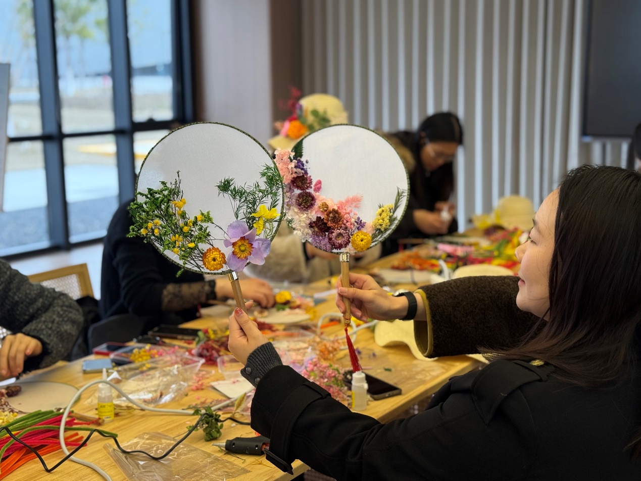 活动现场暖意融融、氛围温馨。物业工作人员提前备好素面草帽、空白团扇、干花、仿真花、丝带、胶水、镊子、扭扭棒等丰富材料,让女教工在忙碌的工作间隙,放下疲惫、静心创作。大家围坐在一起,精心挑选花材、搭配色彩、构思造型,将一朵朵干花、一缕缕丝带巧妙装点在草帽与团扇之上。指尖流转间,普通的草帽变得清新雅致,素白的团扇缀满芬芳,每一件作品都独一无二,承载着大家对生活的热爱与对美好的向往。
